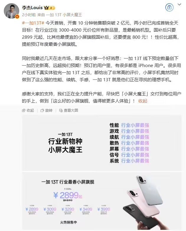 一加13T这波能卖爆也不是没道理,硬件到位、体验在线,价格更是把“卷王”这个名头坐实了。标准版3399元起,叠加国补之后到手价只要2899元,在骁龙8至尊版旗舰中算是很亲民的。